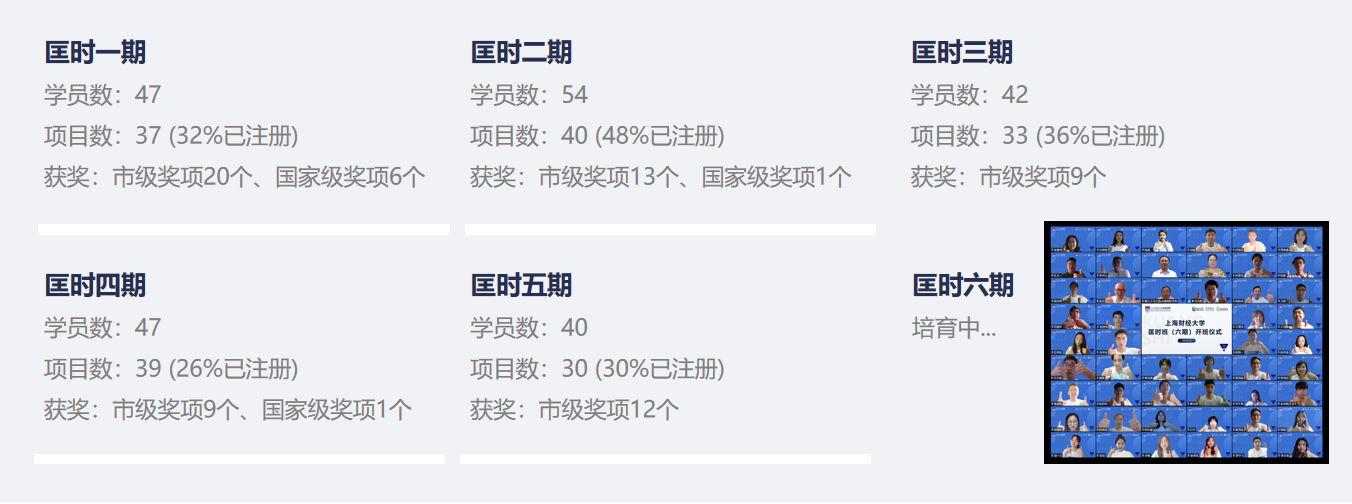 “匡时班”以知识、能力、思维、价值观等创新创业核心素养为课程设计理论依据,以企业导师计划及创业服务为特色,采用集中模块化授课方式,邀请知名学者及创业家校友讲授,每期针对40-50位左右优秀创业者进行系统训练,并引入创业导师、早期创投基金、众创空间等创业加速计划扶持、孵化创业项目;匡时班结业者将成为上财创新创业俱乐部长期成员,获得长期关注和帮扶。