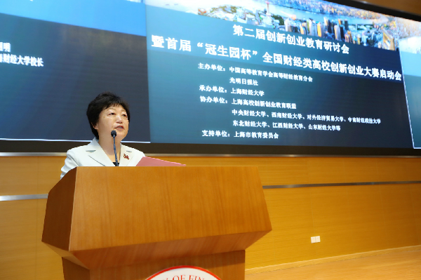 第二届全国创新创业教育研讨会暨首届“冠生园杯”全国财经类高校创新创业大赛启动会,2016年5月21日在我校成功举办。本次活动由中国高等教育学会高等财经教育分会、光明日报社主办,上海财经大学承办,上海市教育委员会支持。中国高等教育学会高等财经教育分会副理事长、秘书长张国才先生,光明日报社记者部副主任殷燕召先生,上海市教委副主任郭为禄教授,冠生园集团总经理万黎峻先生,浙江财经大学校长钟晓敏教授,西南财经大学副校长马骁教授,中南财经政法大学副校长陈明教授,山东财经大学副校长胡文波教授,山西财经大学副校长马培生教授,安徽财经大学副校长张庆亮教授,南京财经大学副校长邱伟芬教授,云南财经大学副校长王晓萍教授,广东财经大学副校长杜承铭教授,吉林财经大学副校长杨春梅教授,上海应用技术大学副校长叶银忠教授,山东工商学院副书记郭金创教授,重庆工商大学副校长郑旭煦教授,复旦大学教务处处长徐雷教授等高校嘉宾近200人莅临现场。我校樊丽明校长、刘兰娟副校长出席了会议。大会分为大赛启动仪式、主旨演讲、圆桌论坛、示范教学展示几个环节。
